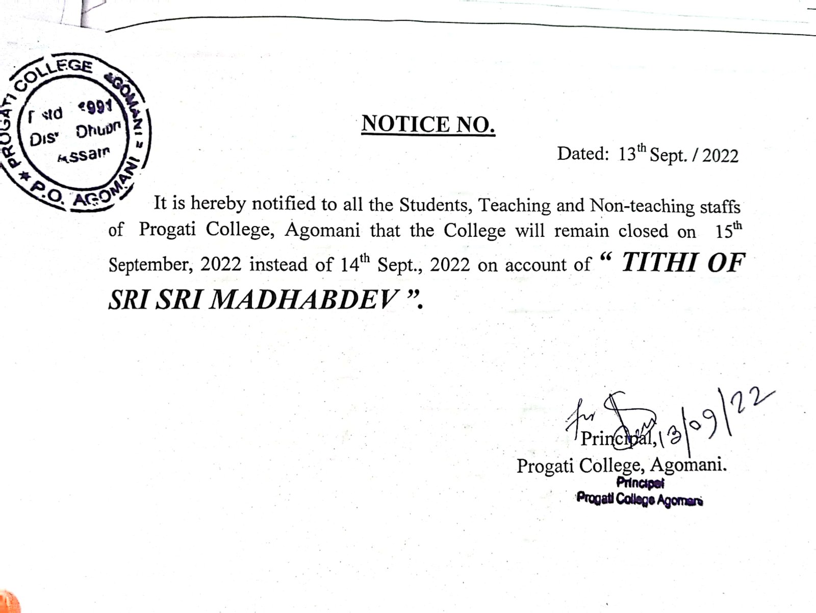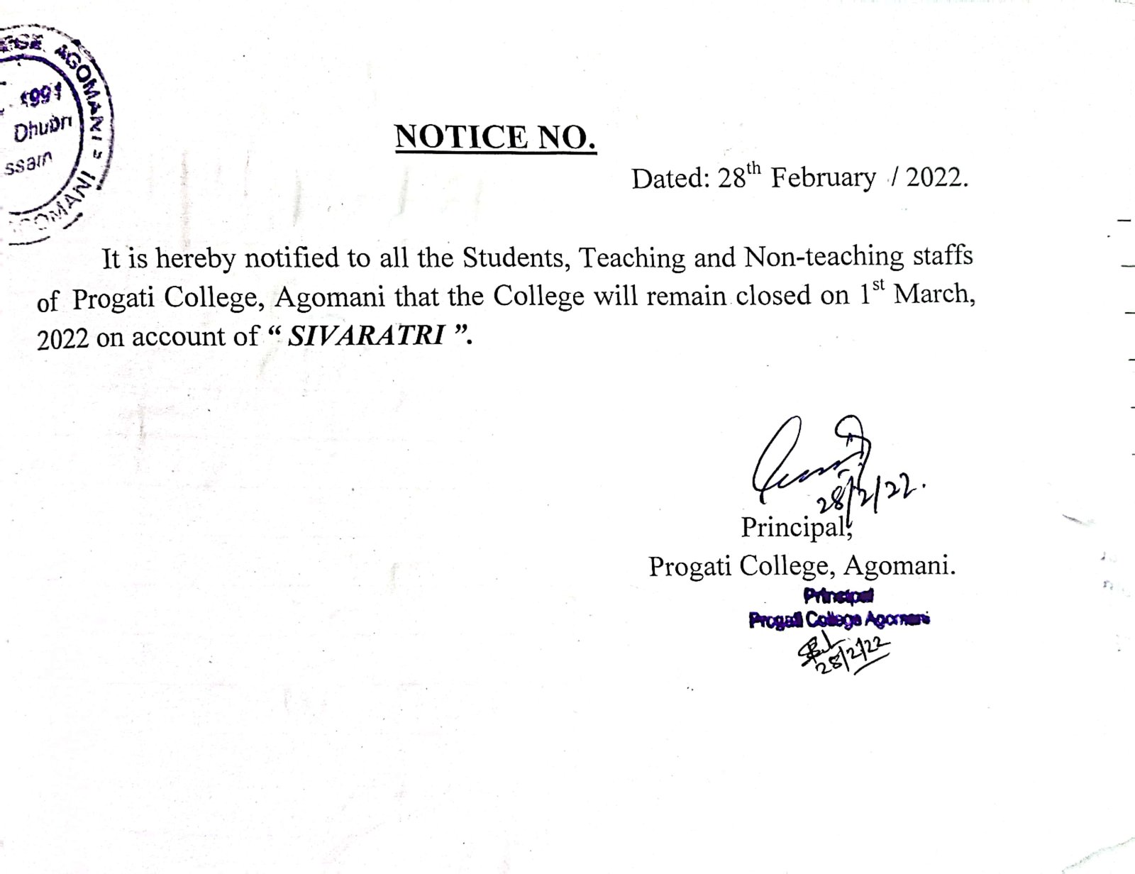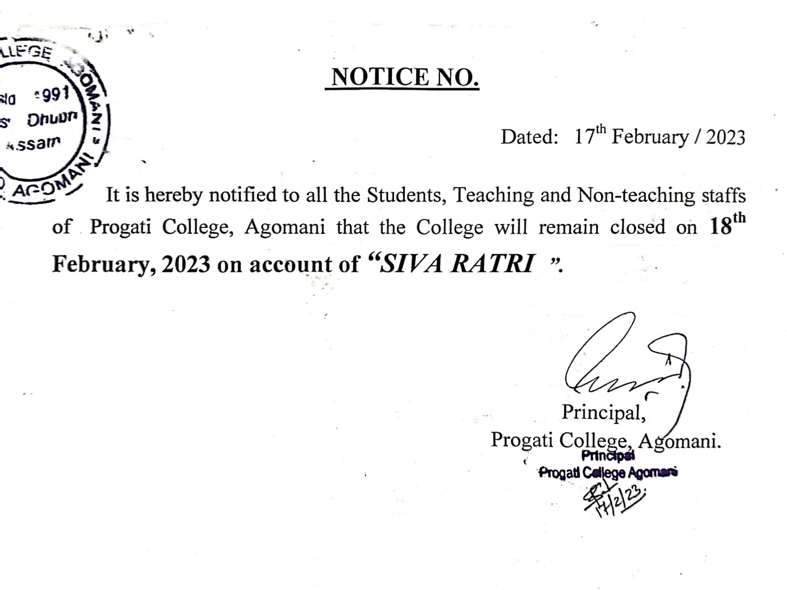 Notice for Sivaratri |
