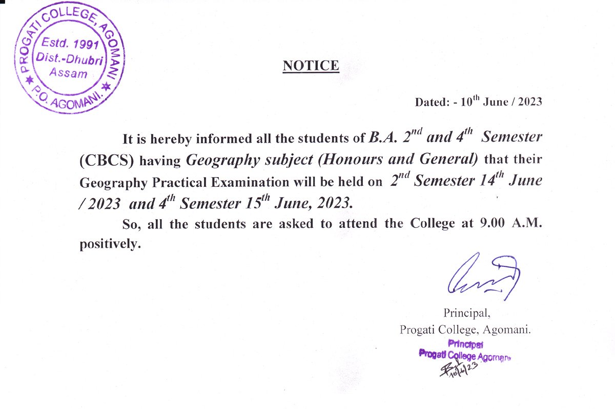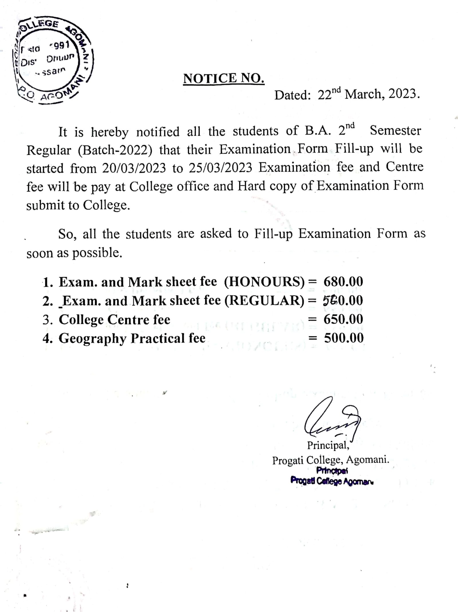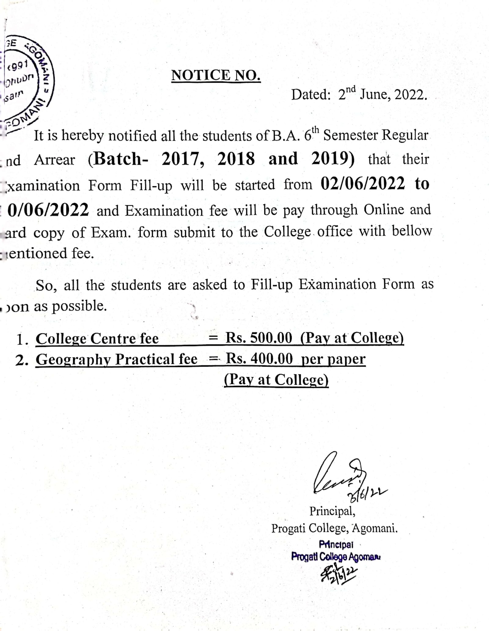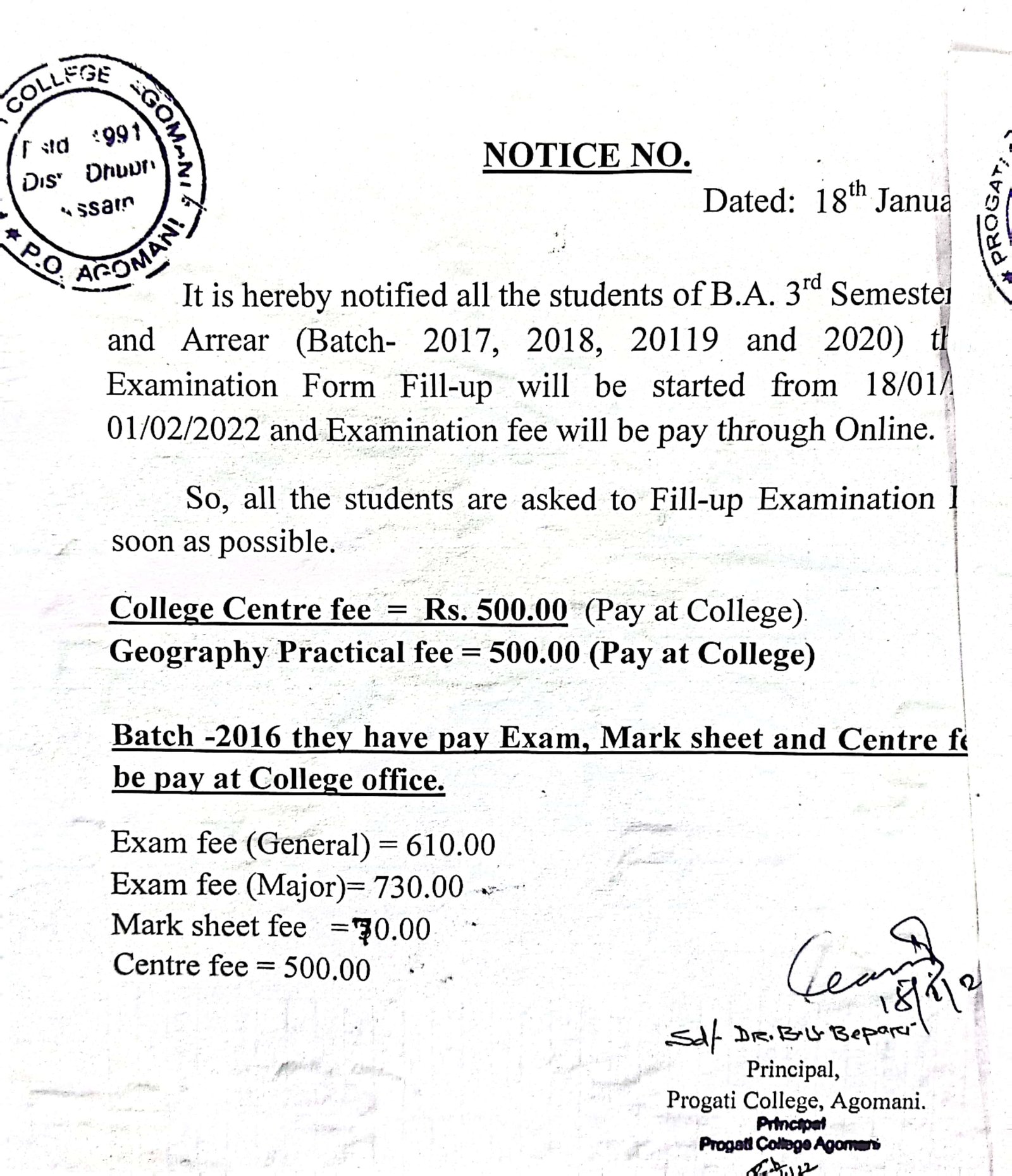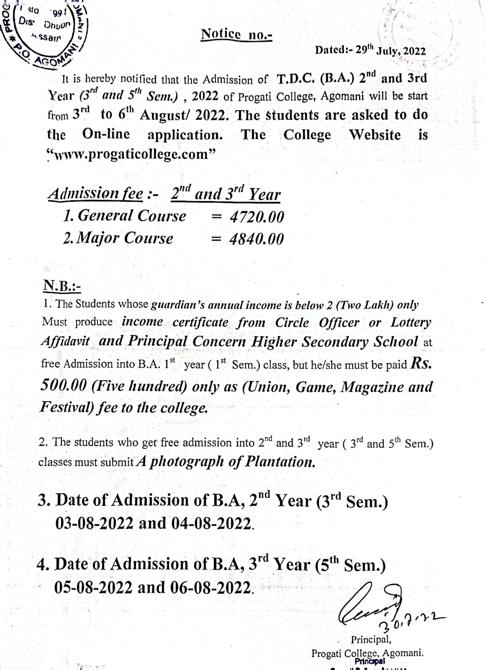 Revise Notice for Admission Fee of B.A. 3rd Sem & 5th Sem 2024 Progati College, Agomani |