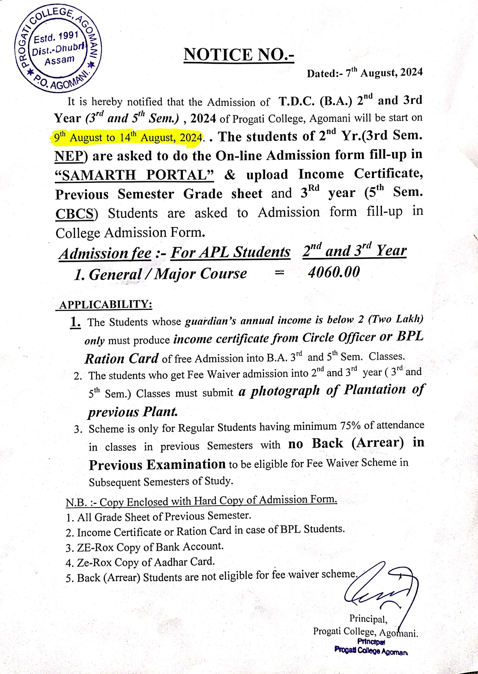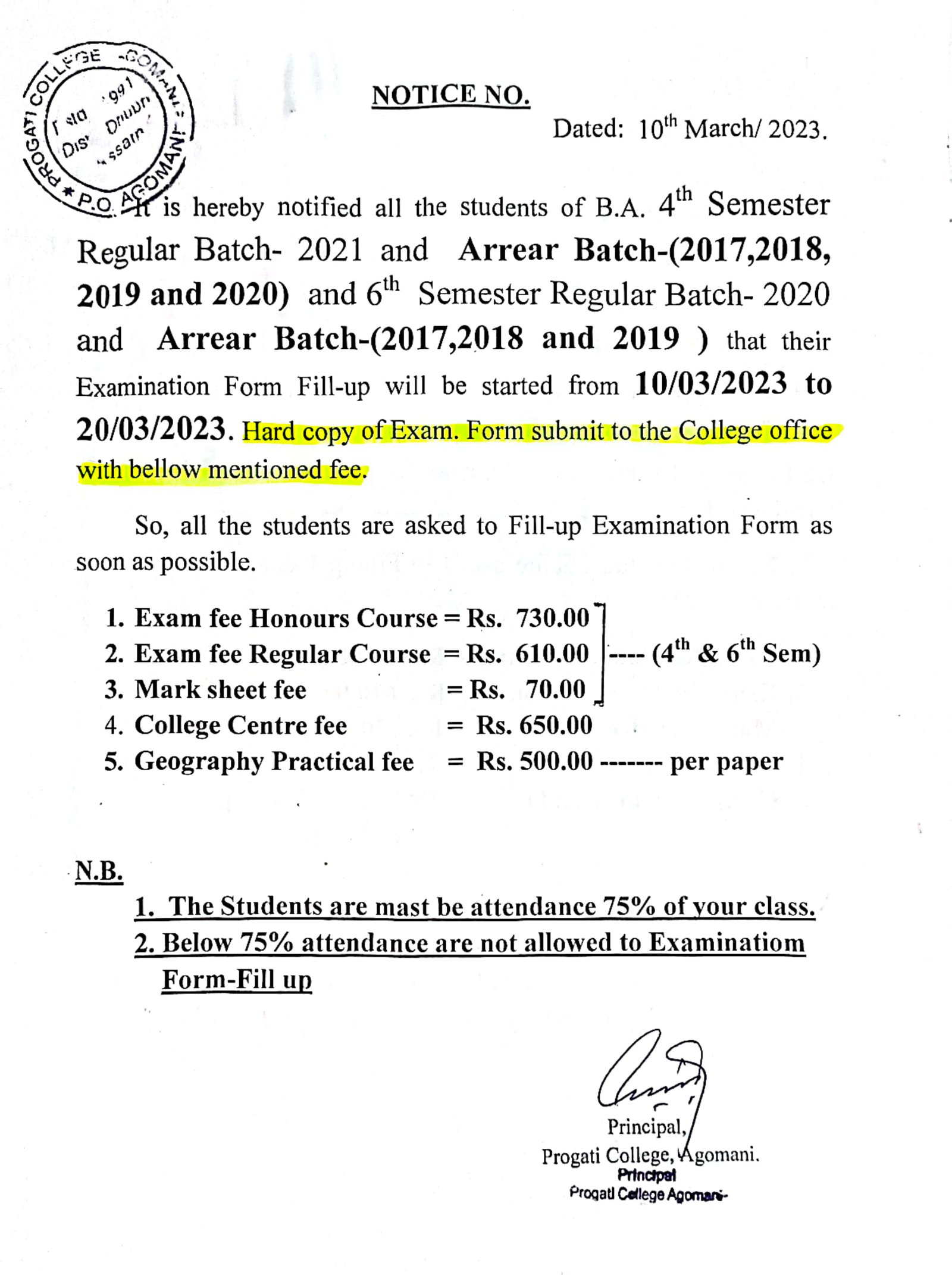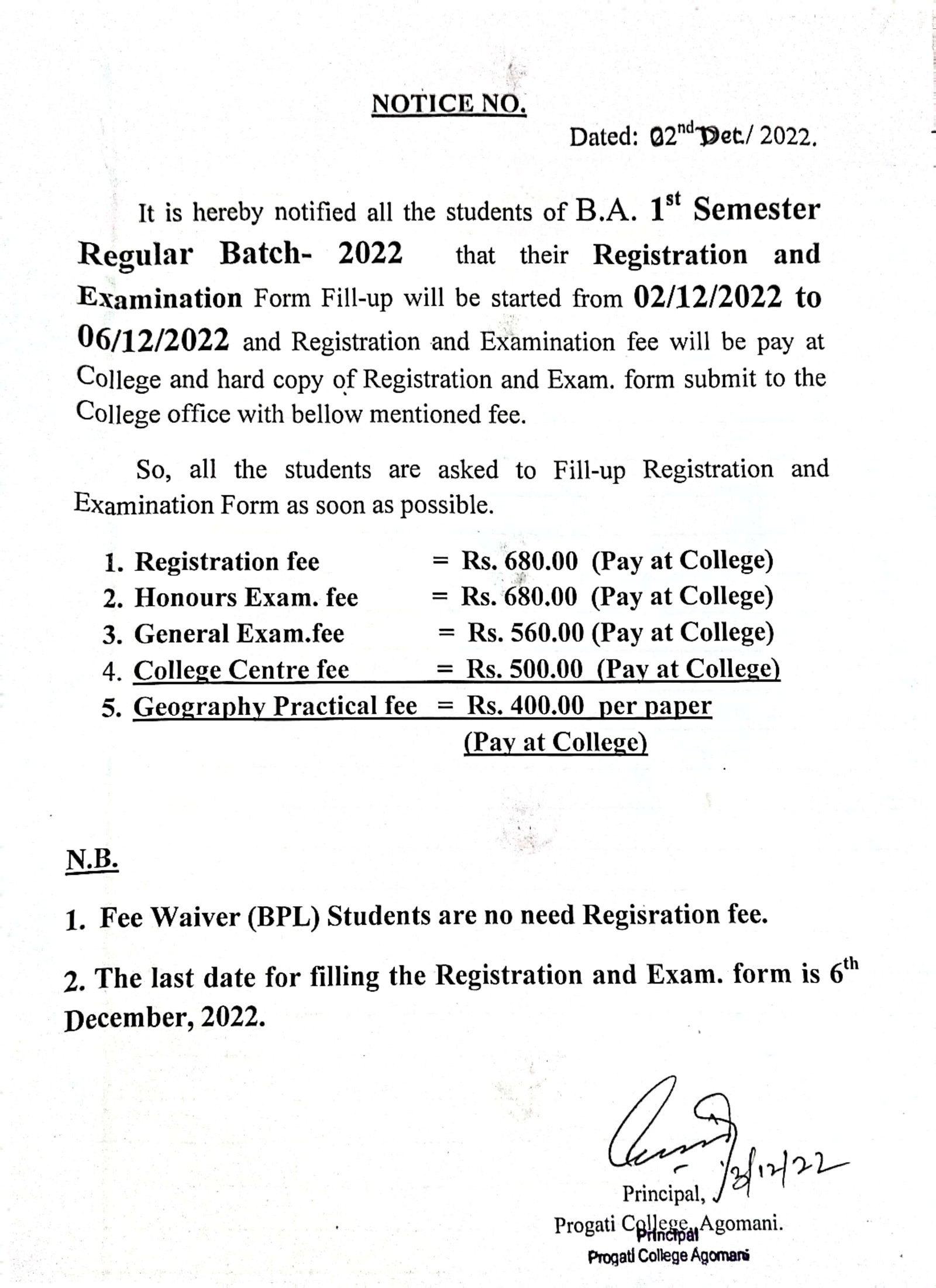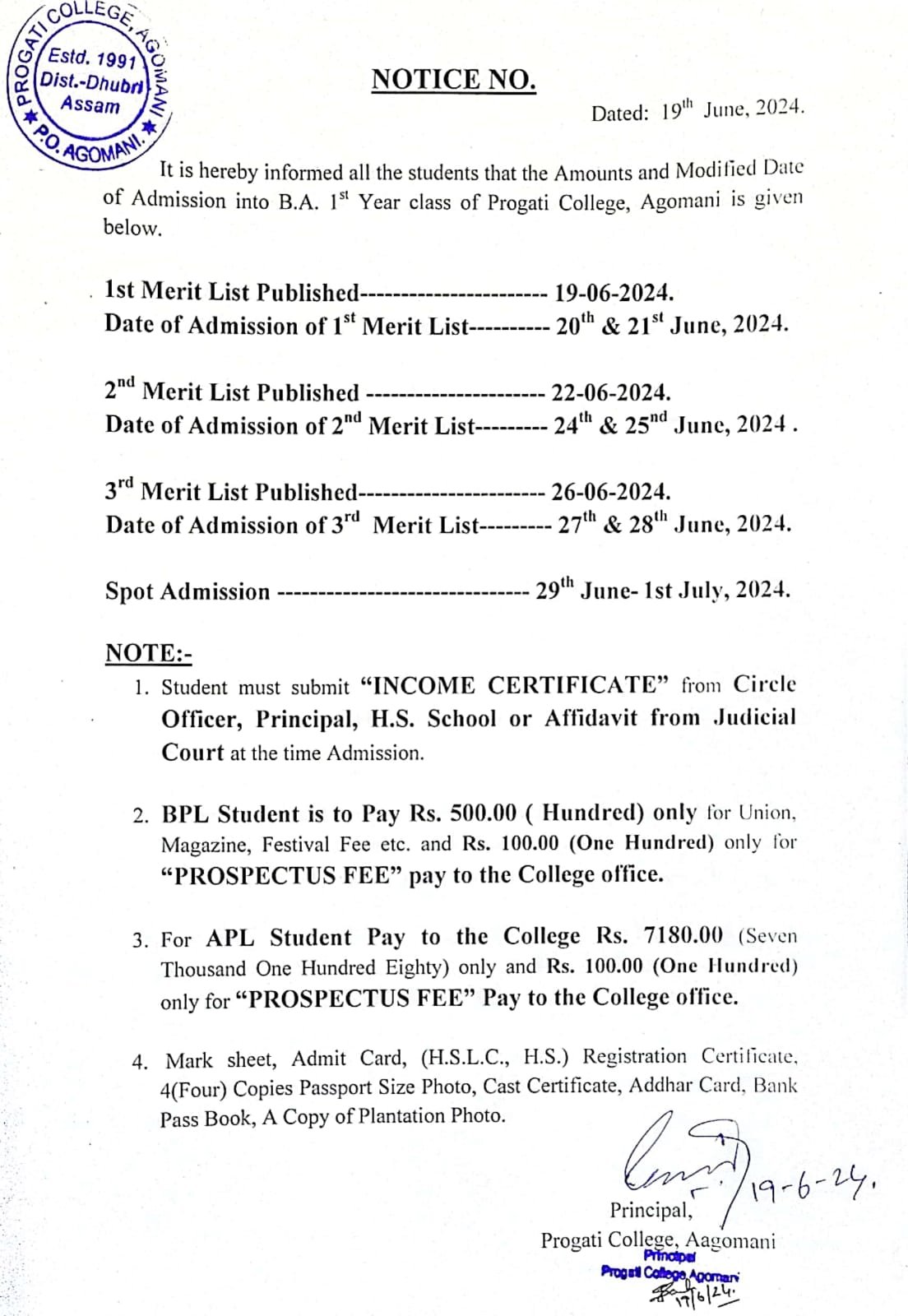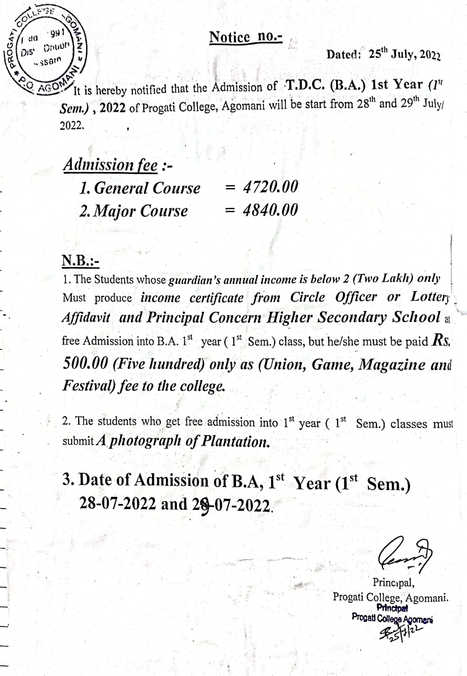 Revise Notice for Admission Fee of B.A. 3rd Sem & 5th Sem 2024 Progati College, Agomani |