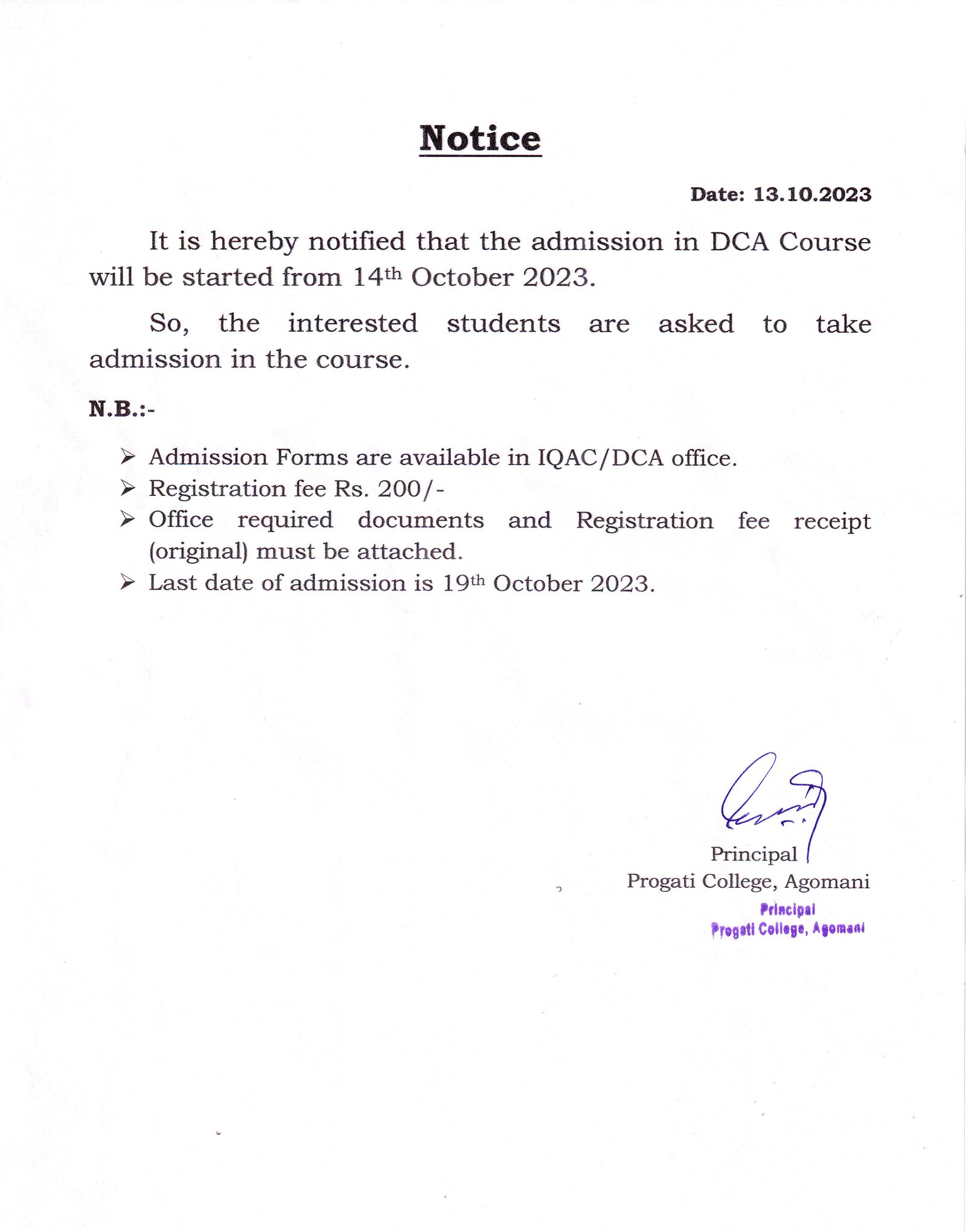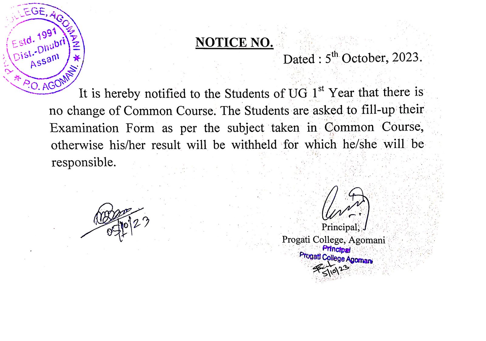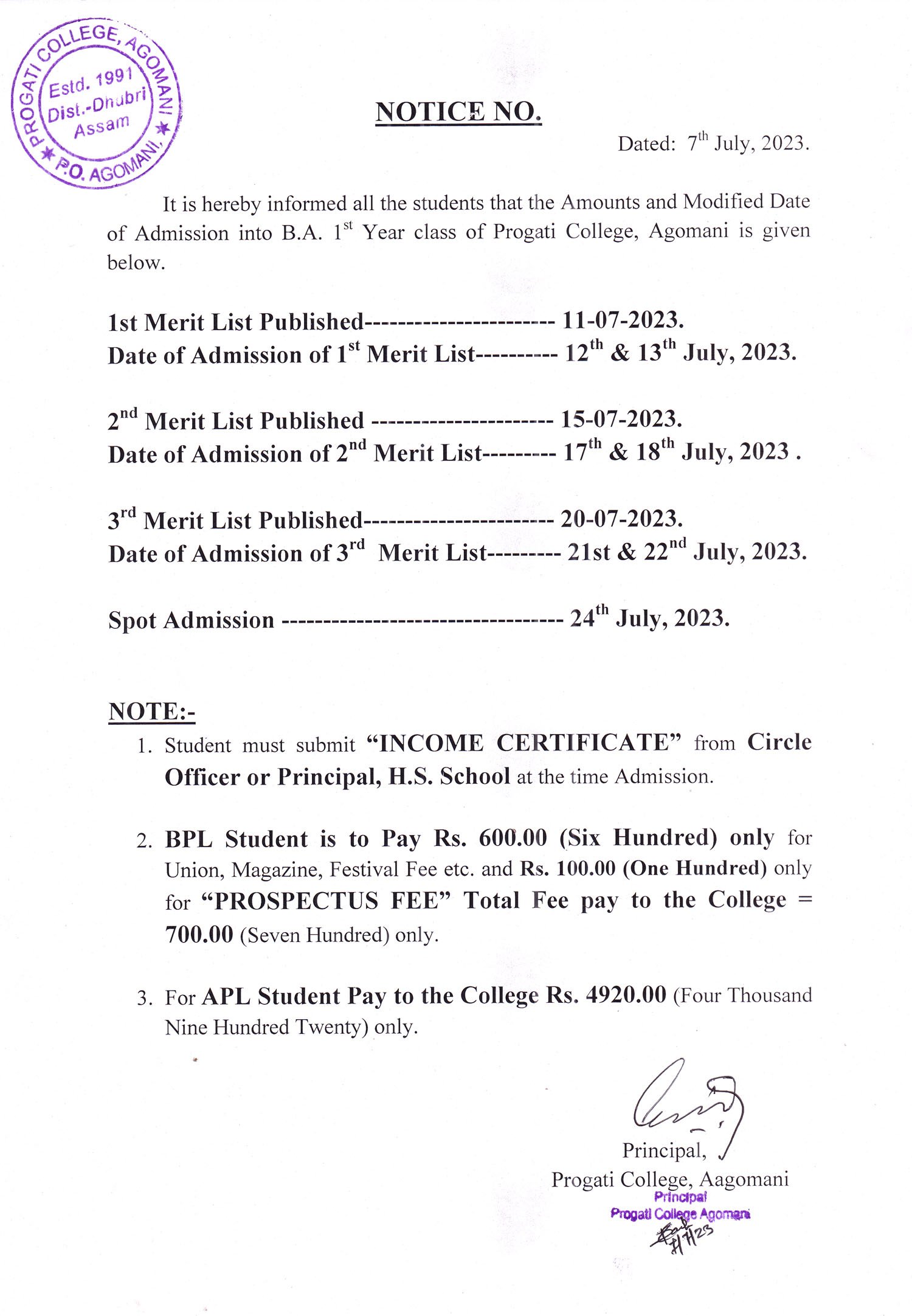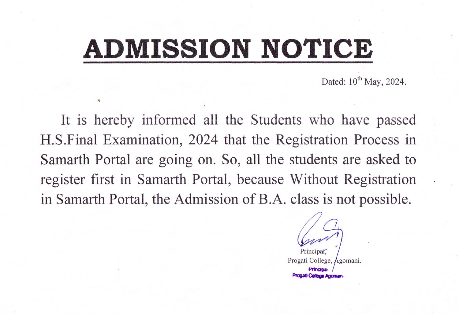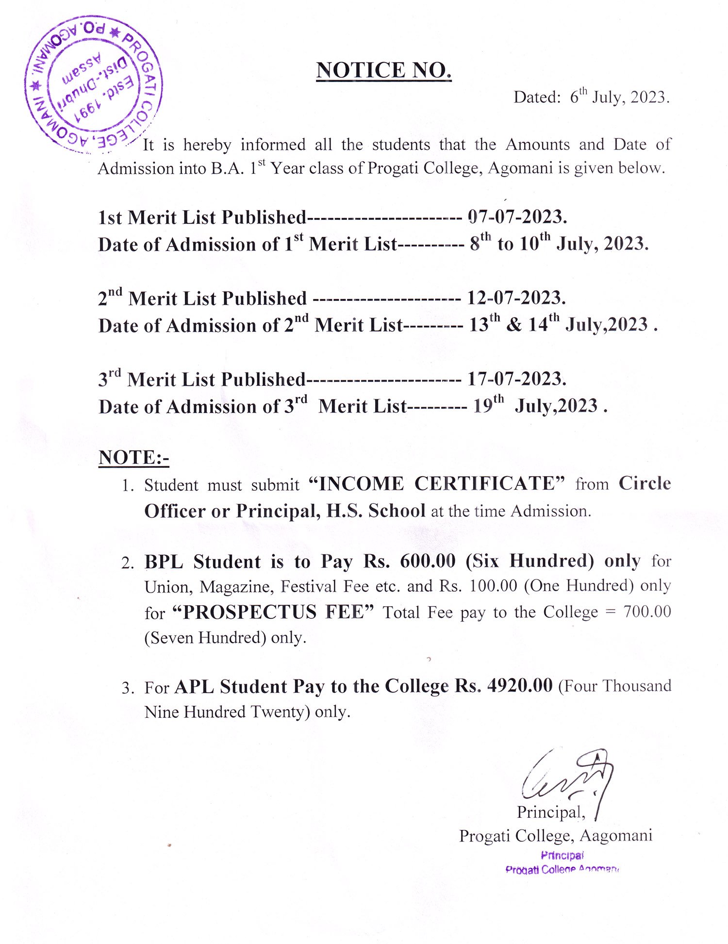 Revise Notice for Admission Fee of B.A. 3rd Sem & 5th Sem 2024 Progati College, Agomani |