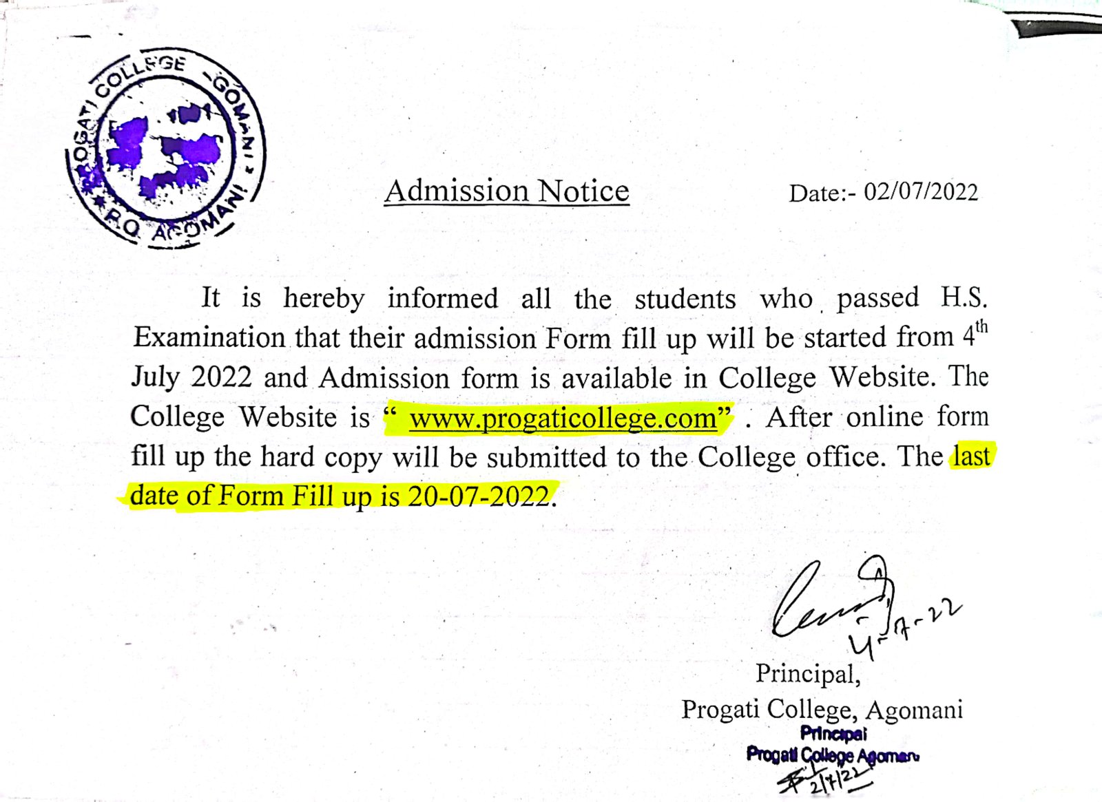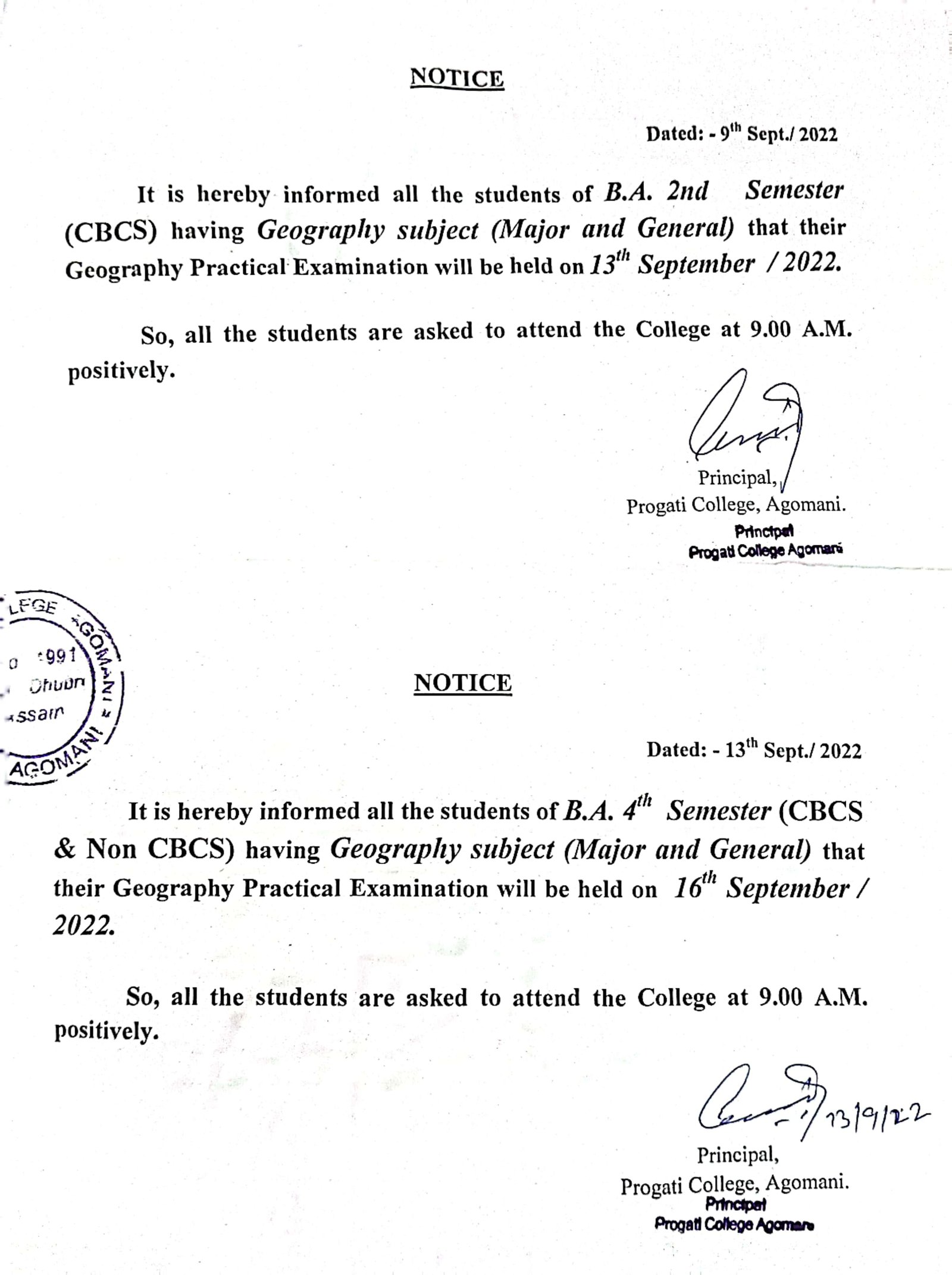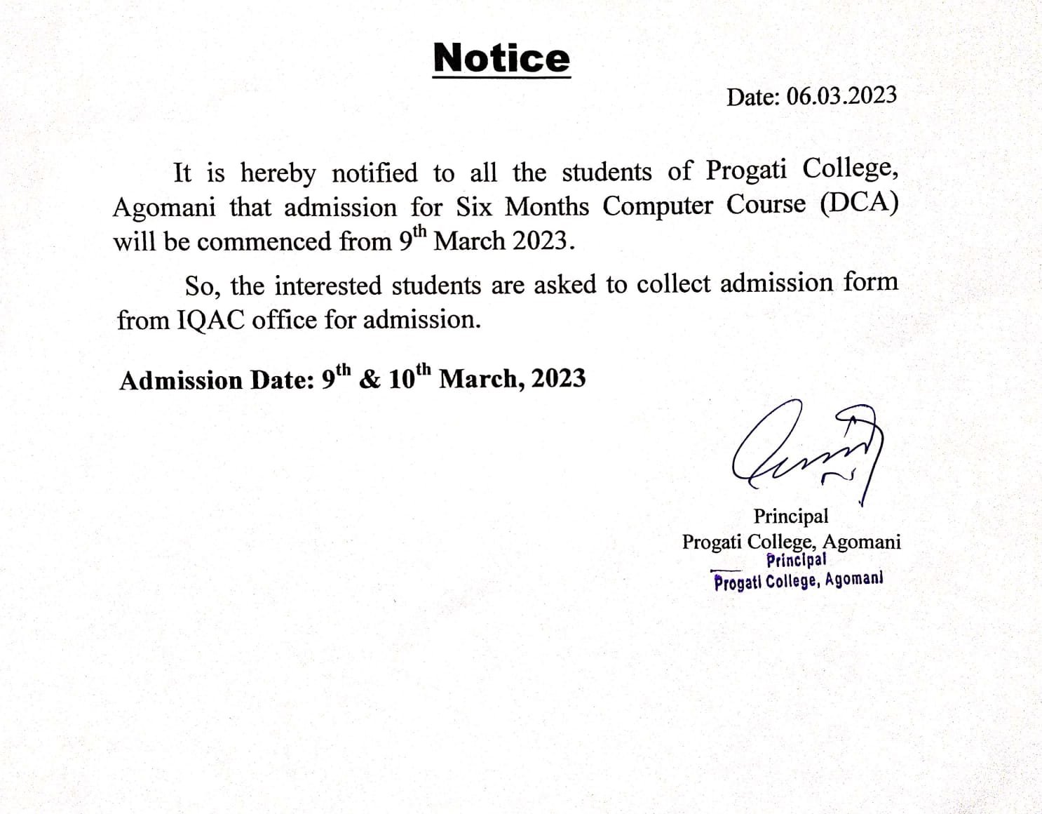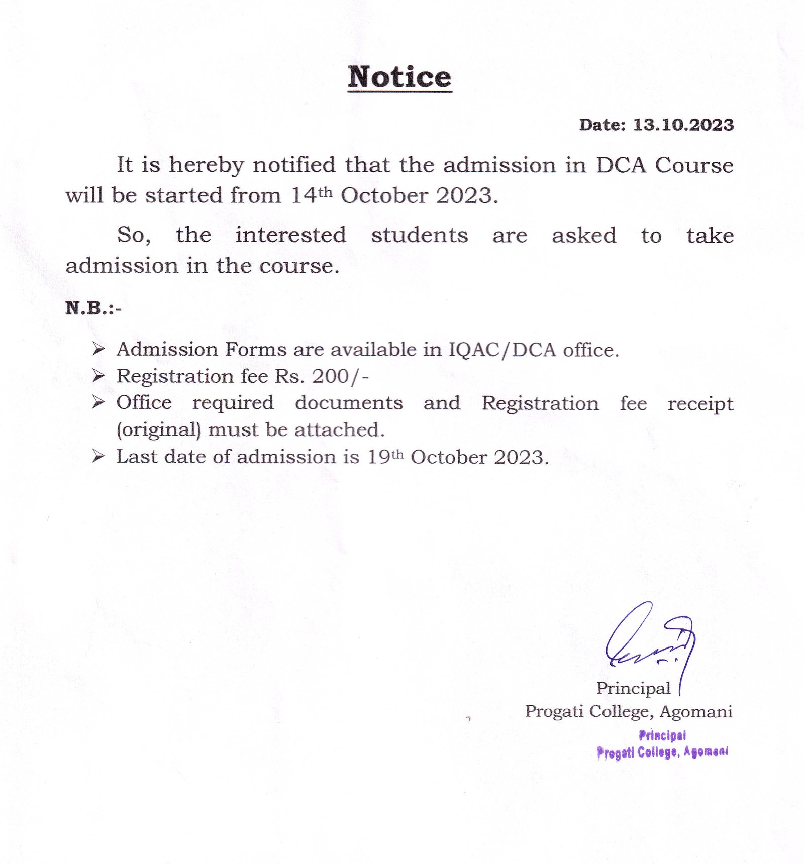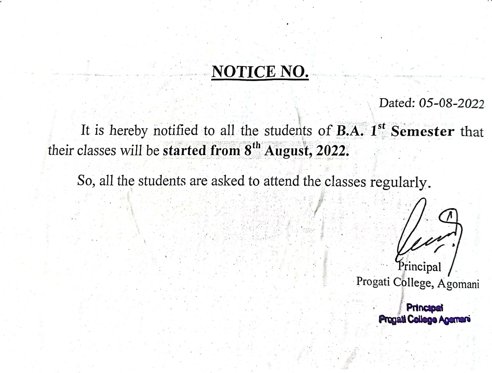 Revise Notice for Admission Fee of B.A. 3rd Sem & 5th Sem 2024 Progati College, Agomani |