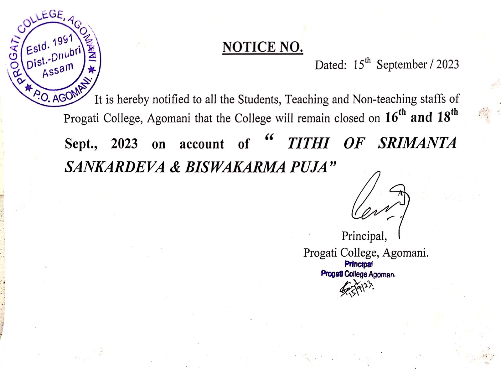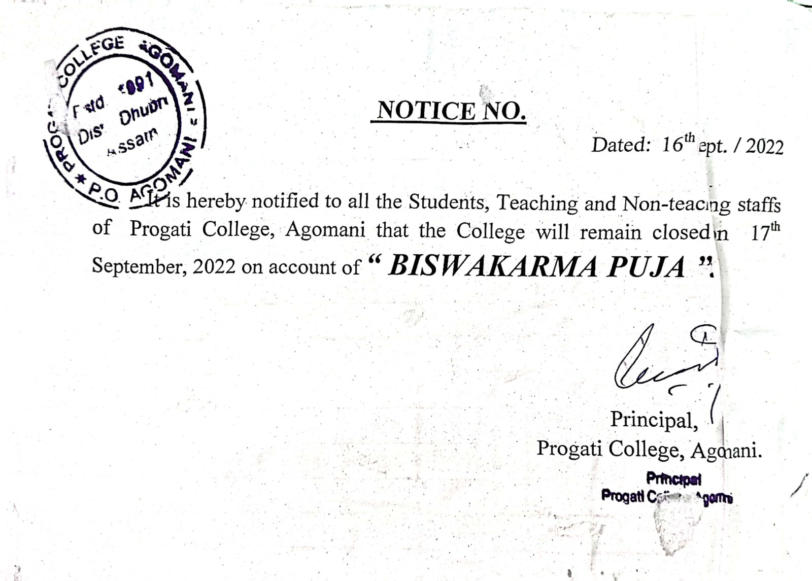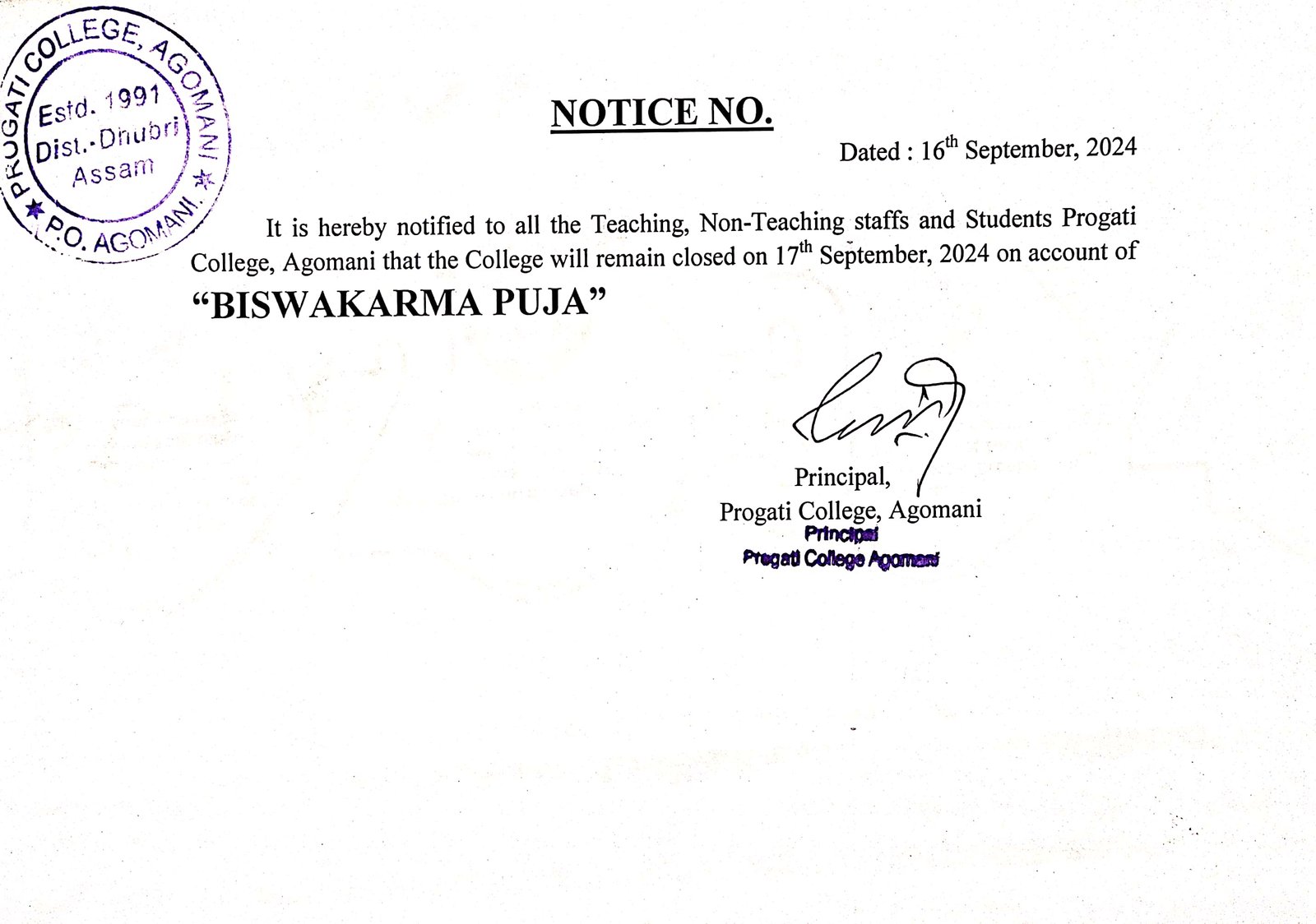 Notice for Biswakarma Puja 2024 |