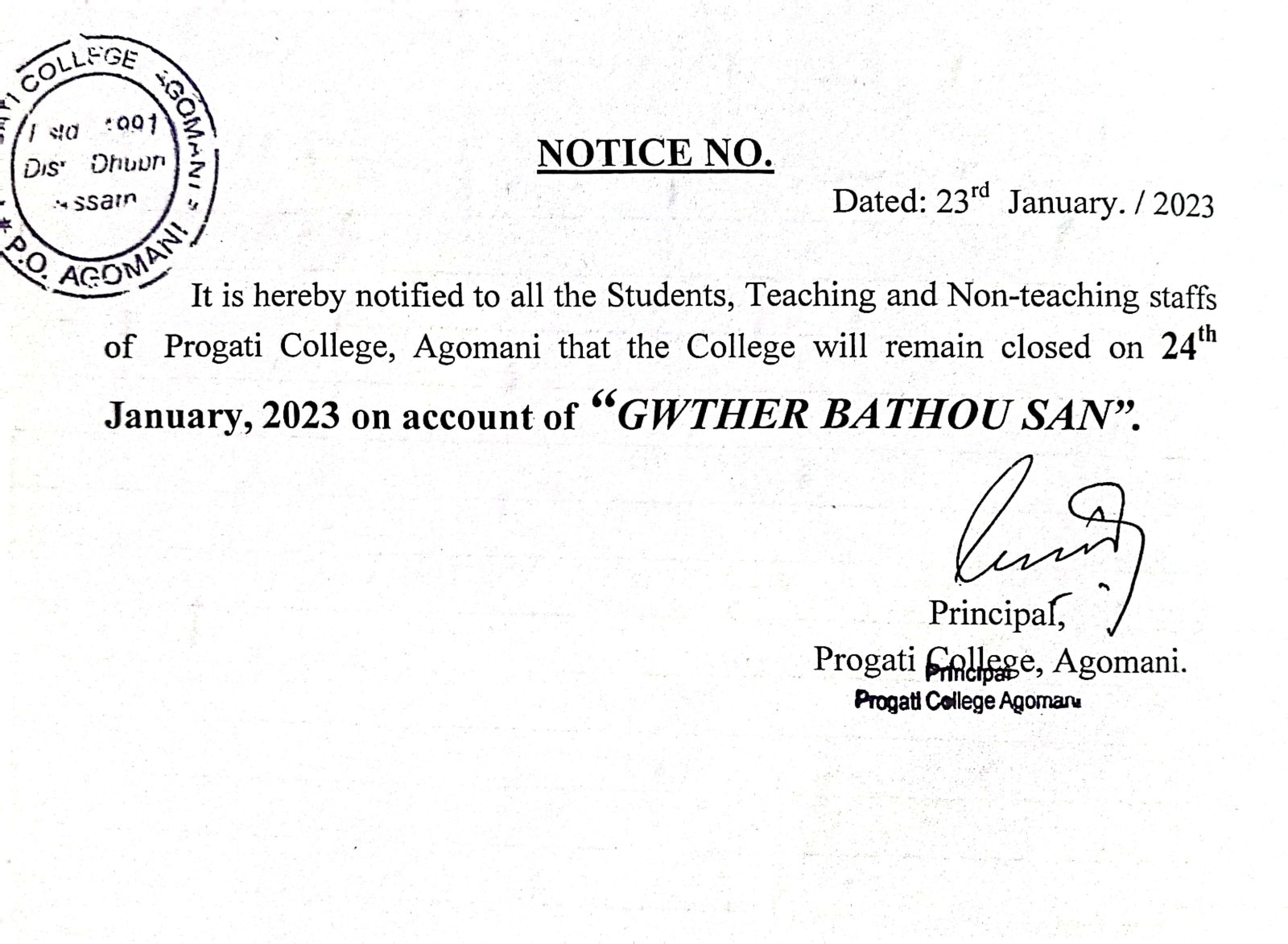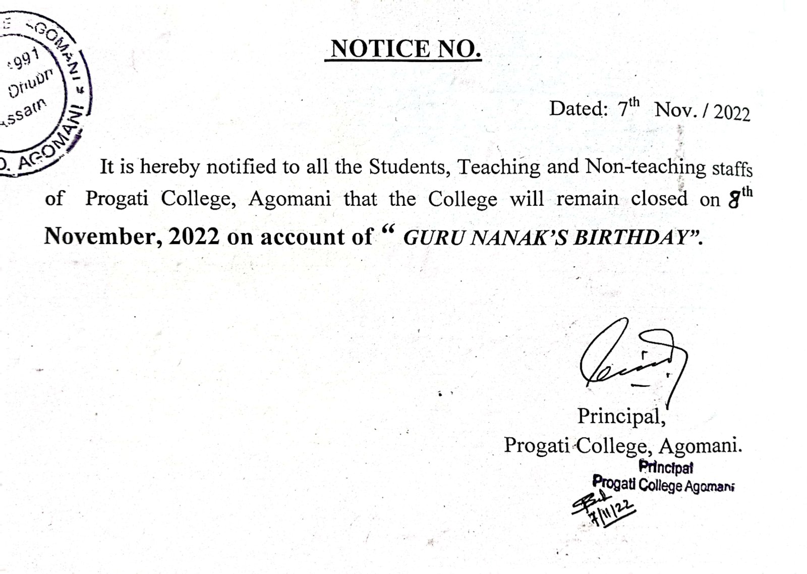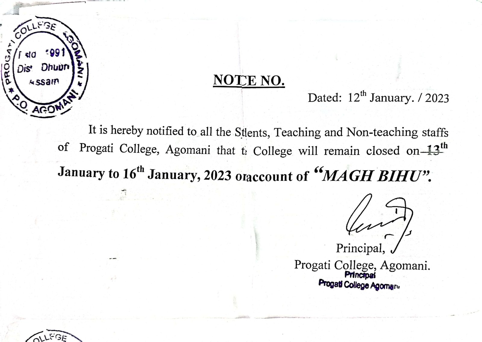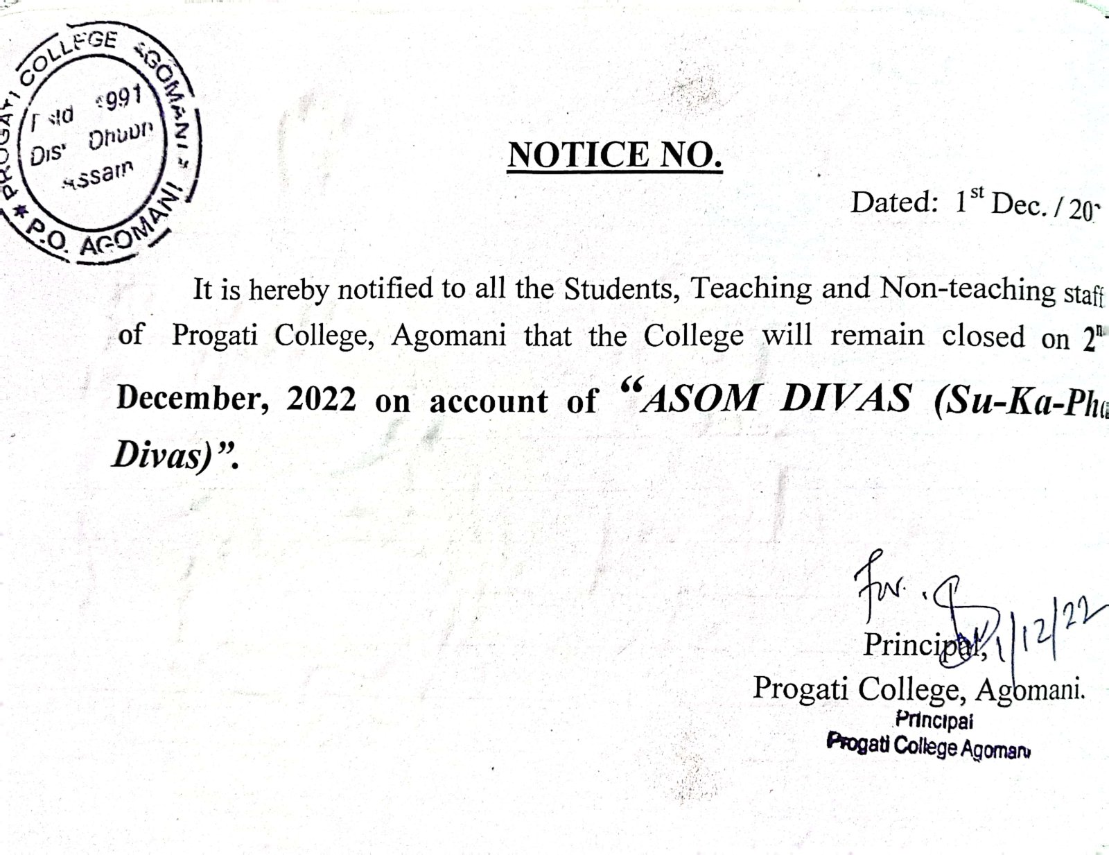 Notice for Bohag Bihu & Good Friday |