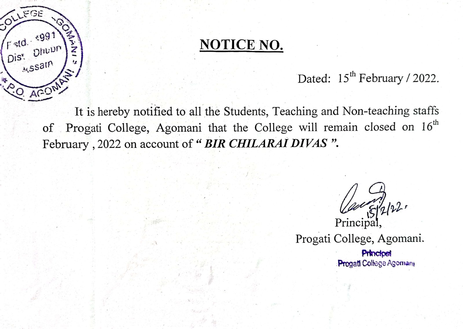 Notice for Bir Chilarai Divas |