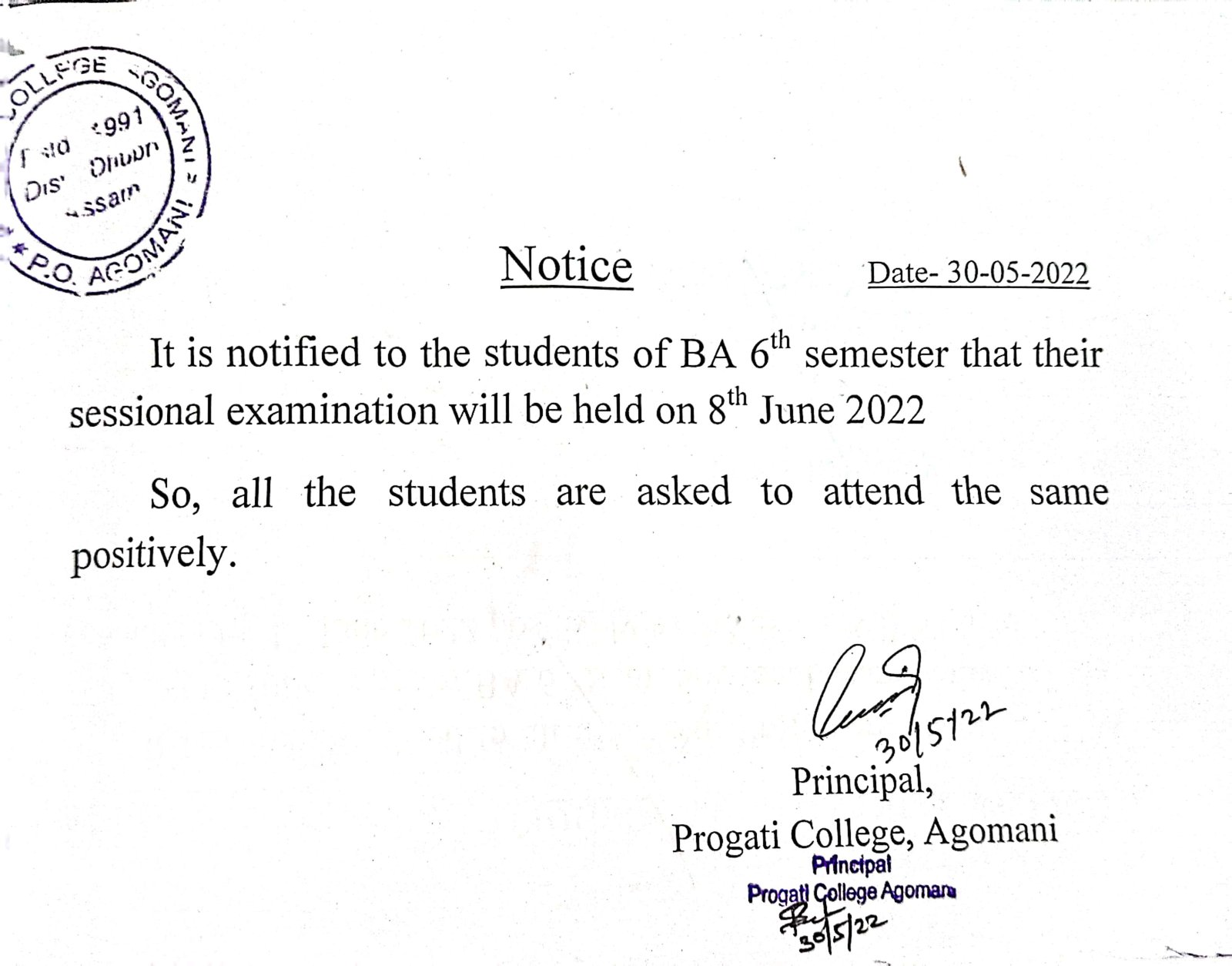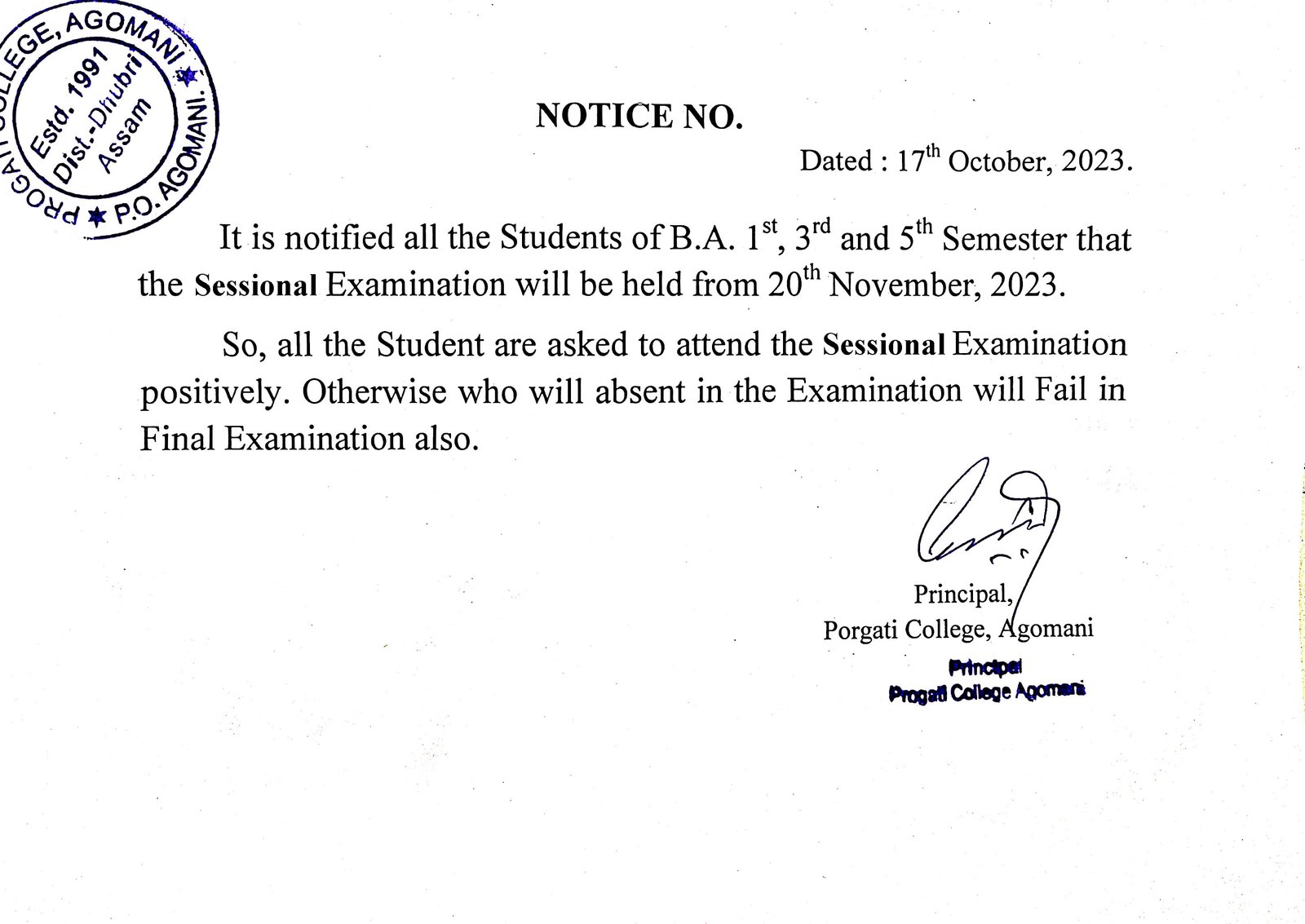Notice for Sessional Examination |