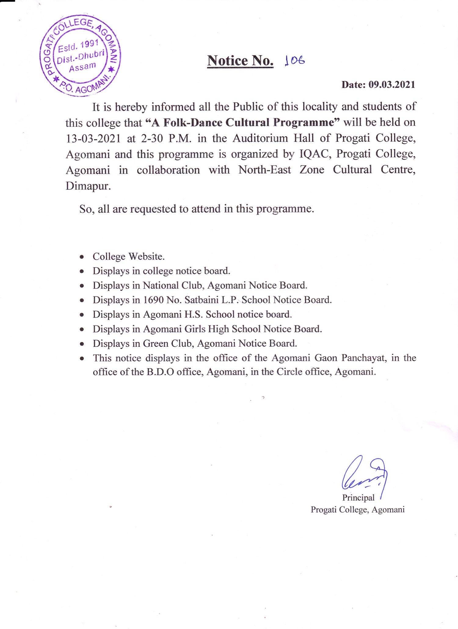 NOTICE FOR A FOLK DANCE CULTURAL PROGRAMME |