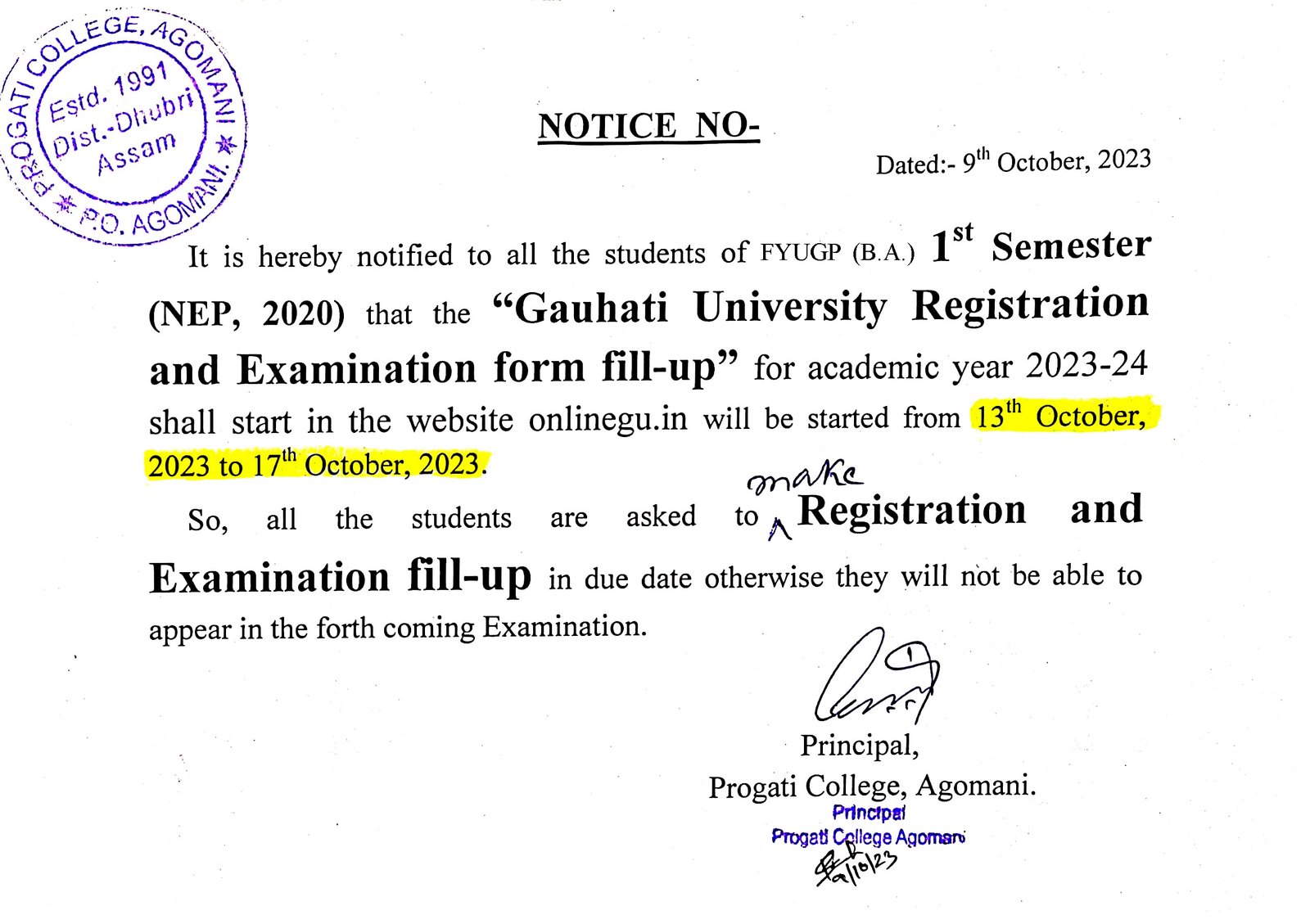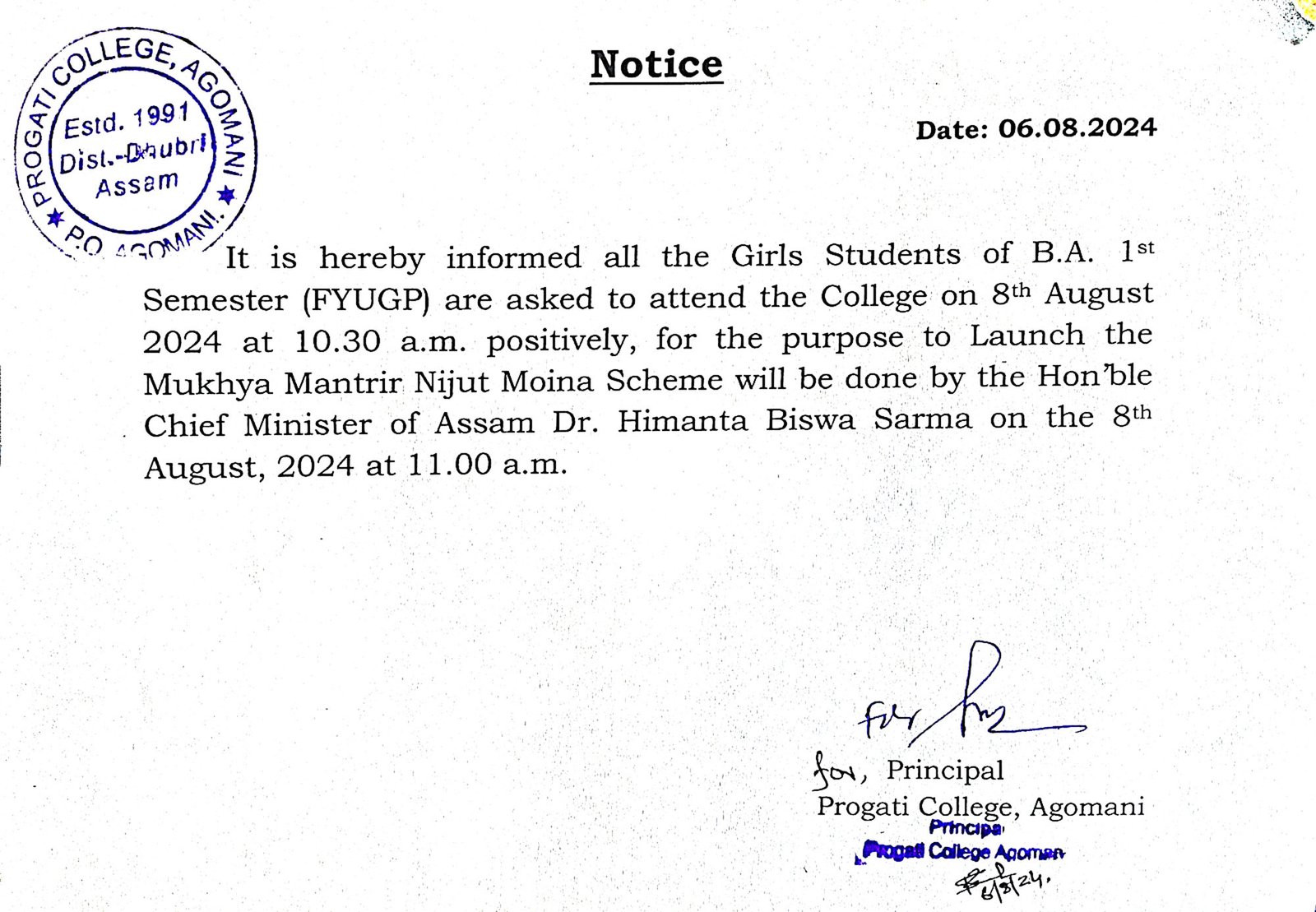 Notice for B.A. 1st Semester (FYUGP) for the Purpose of Mukhya Mantrir Nijut Moina Scheme 2024 |