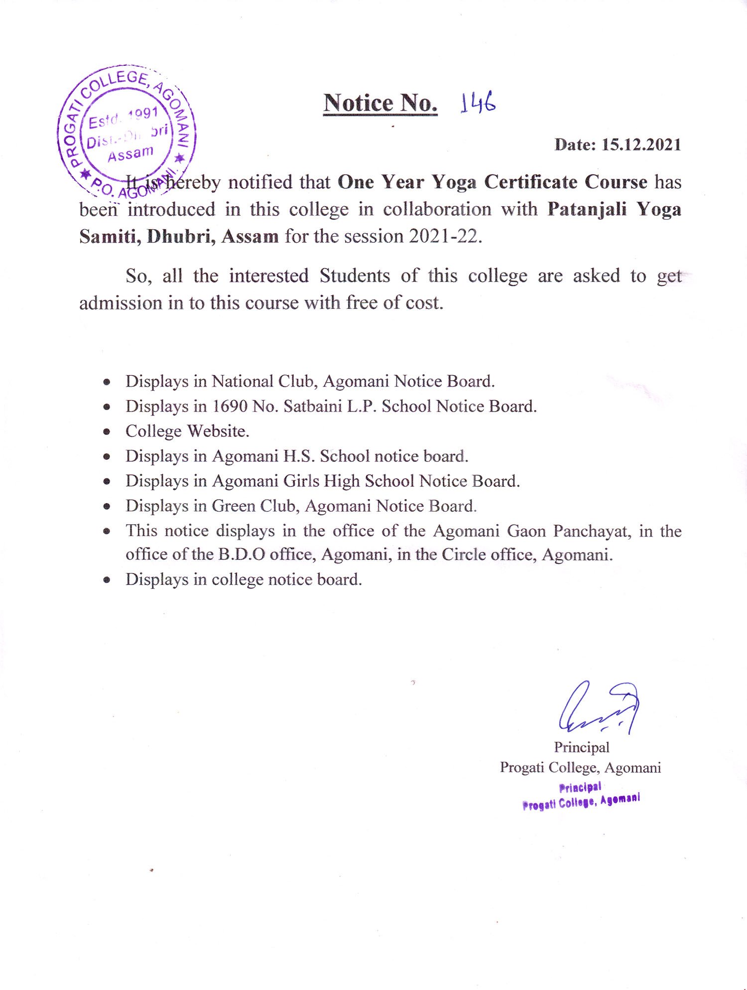 Notice for One Year Yoga Certificate Course |