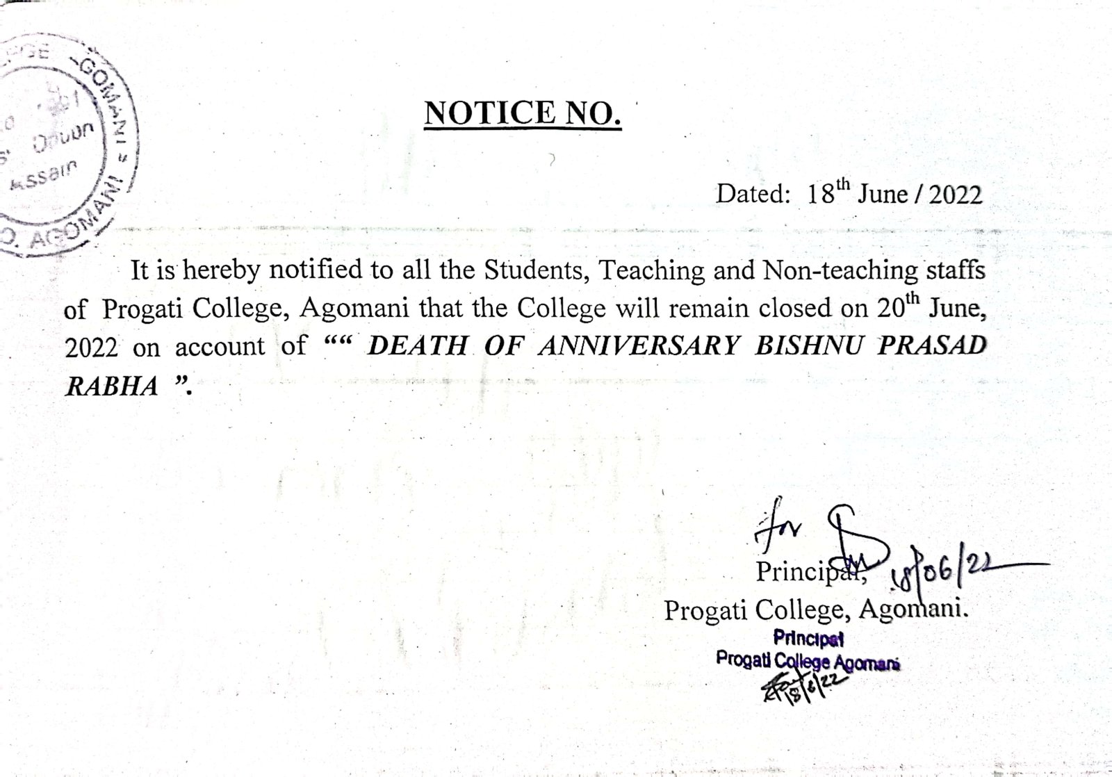 Notice for Death of Anniversary Bishnu Prosad Rabha |