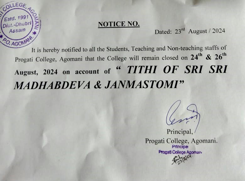 Notice for Tithi of Sri Sri Madhabdeva & Janmastomi 2024 |